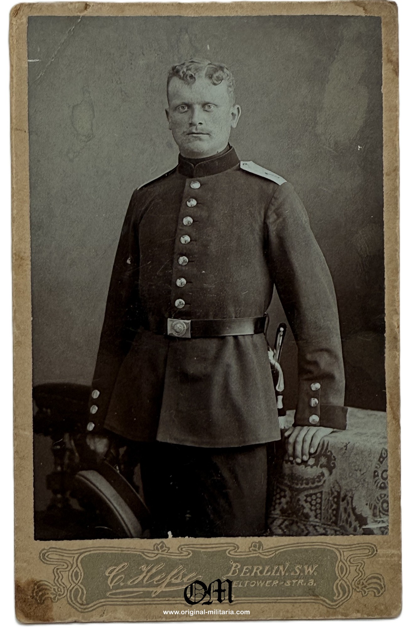 Black and white cardboard studio portrait or cover letter to a soldier made in a Berlin studio, located at Eltower 3. Measuring 6.5 cm x 10.5 cm.